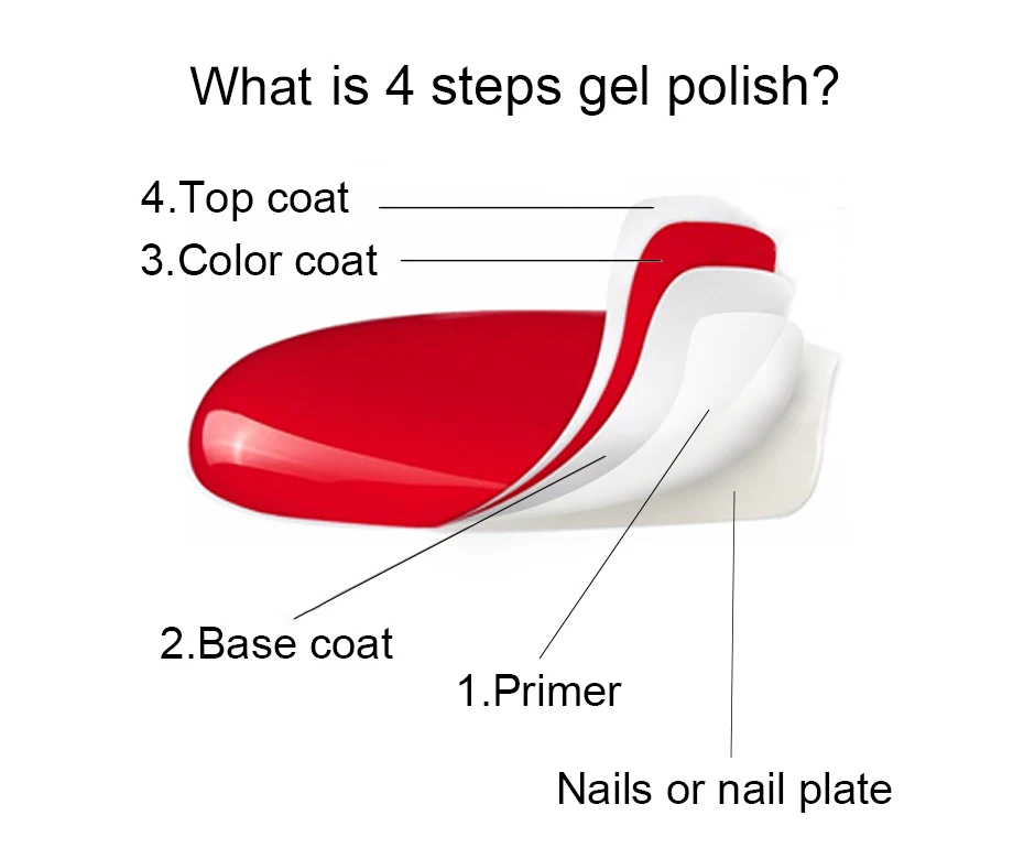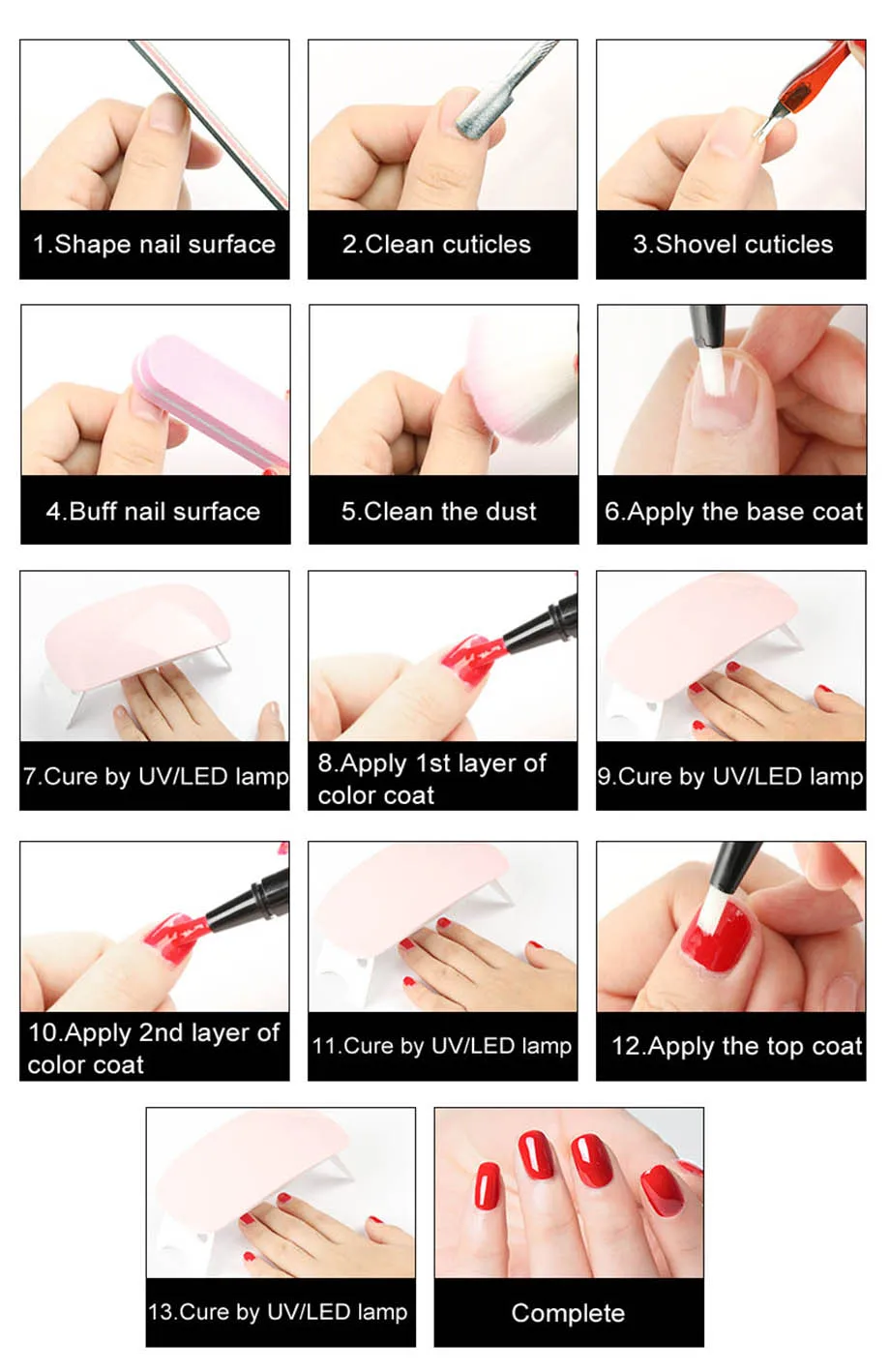 Step by Step: -1. Shape the nail. Lightly buff the surface of the nail plate. Sanitize. -2. Apply a base coat of foundation from the cuticle to the free edge (Remember to seal the edge of the nail). Cure the nails under the LED light for 10 seconds or a UV light for 2 minutes. -3. Apply a thin coat of Soak-Off Gel Polish color of choice. Cap free edge. Cure: 30 seconds in LED Lamp, or 2 minutes in UV lamp. -4. Repeat the 2nd thin coat of the soak off Gel Polish to the nails. Cure under the LED lamp for 30 seconds or a UV light for 2 minutes. -5. Apply a top coat. Cap free edge. Cure:30 seconds in LED lamp. -6. Remove the tacky residue on nails with the cleanser. Then, apply nourish cuticle oil to rehydrate moisture into the cuticle and the skin surrounding the nail.
