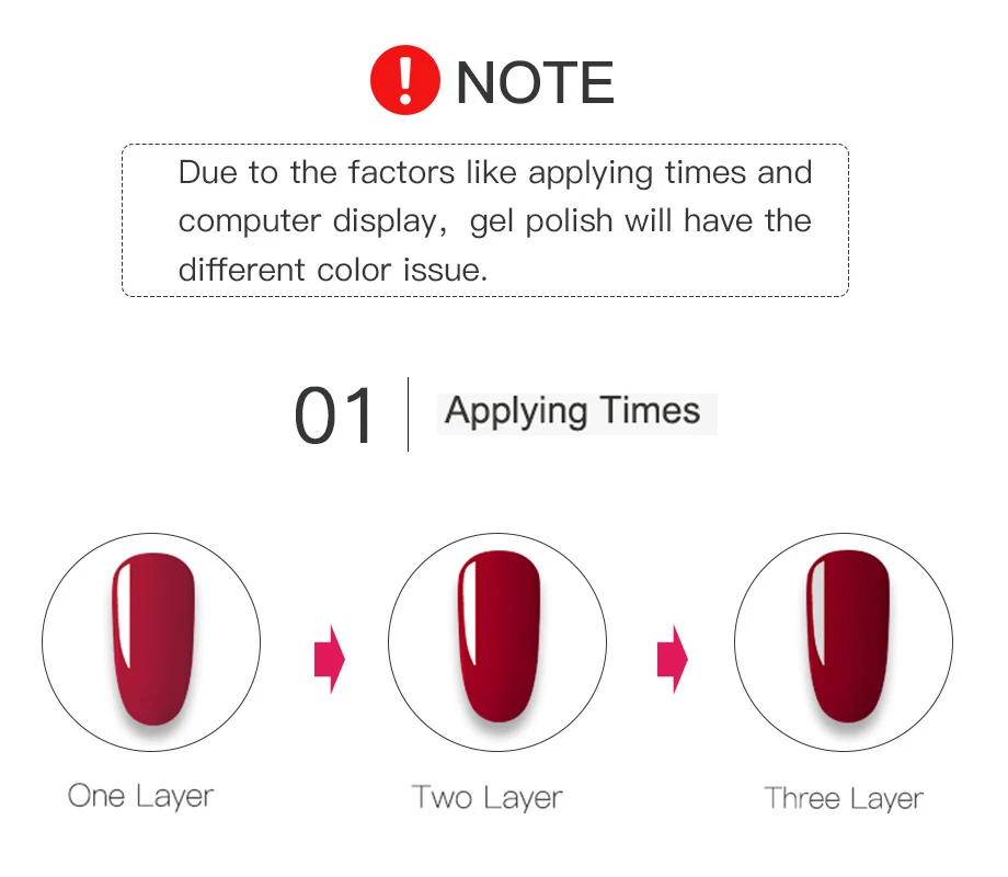 Caution: 1.The volume is 5ml. Since the capacity of the bottle is more than 5ml, the gel polish will not fully filled with the bottle! 2.Keep tightly sealed. Keep out of sunlight. Keep out of reach of children.